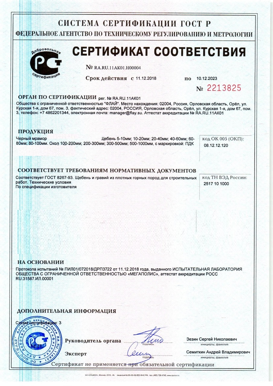 Сертификат соответствия – документ, подтверждающий соответствие продукции требованиям качества и безопасности, установленными для нее действующими стандартами и правилами. Наш камень, который Вы сможете заказать с доставкой в Иркутске , обладает всеми необходимыми документами для реализации и при необходимости могут быть предоставлены все необходимые подтверждающие документы при поставке.